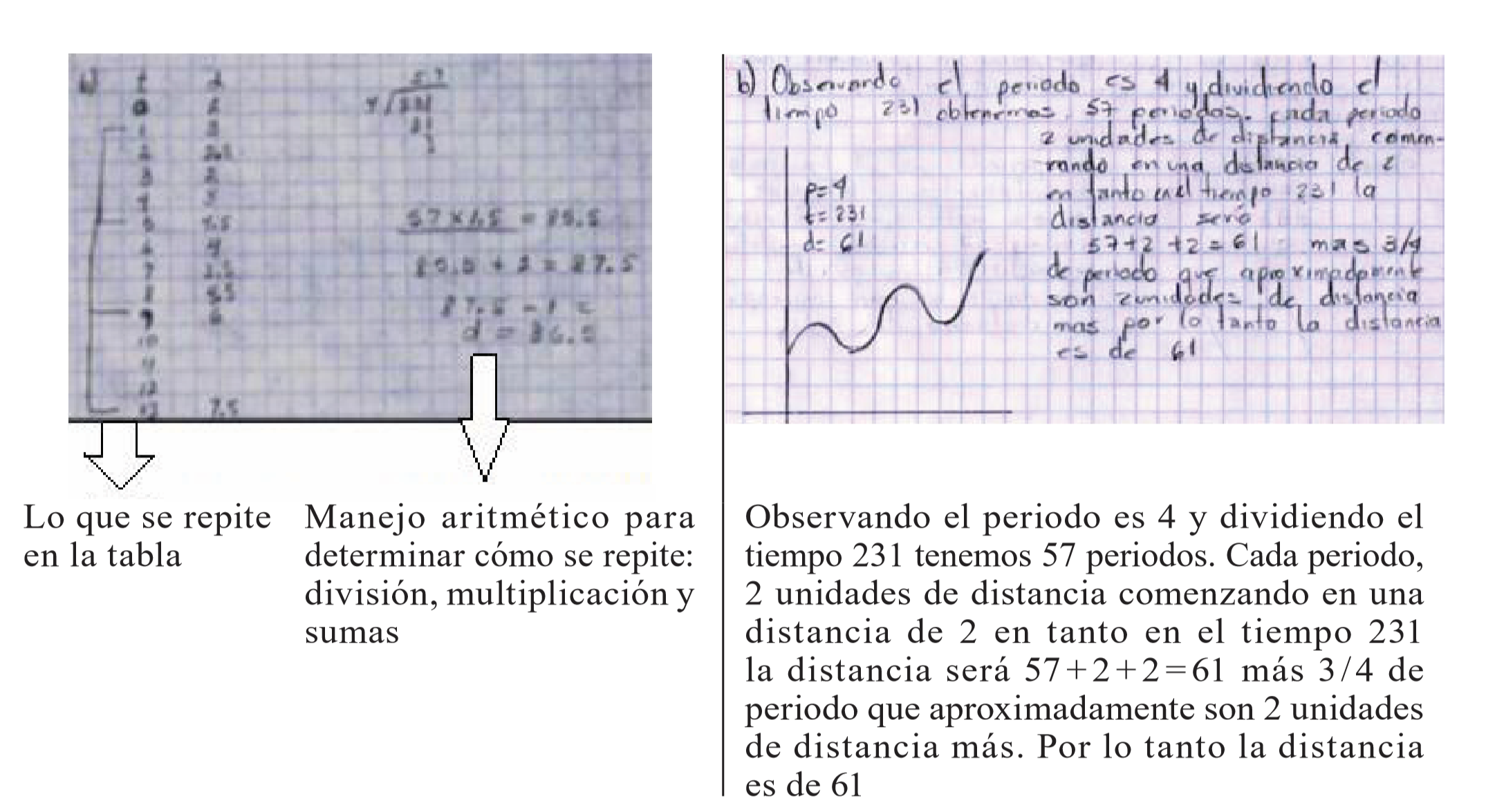 Por ejemplo, Buendía y Cordero (2005) plantean una tarea que pide a diferentes estudiantes de posgrado predecir en una gráfica tiempo - distancia (figura 6) dónde estará el móvil en el tiempo , y puede verse cómo se usa una unidad de análisis. En la figura 7, se observa como herramienta el uso de tablas distancia - tiempo en el que se marca el periodo, y luego con ese periodo de 4 se realiza la predicción por medio de una división. En la figura 8 puede verse que el argumento es gráfico, pues toma en cuenta cuánto sube el gráfico en cada periodo.