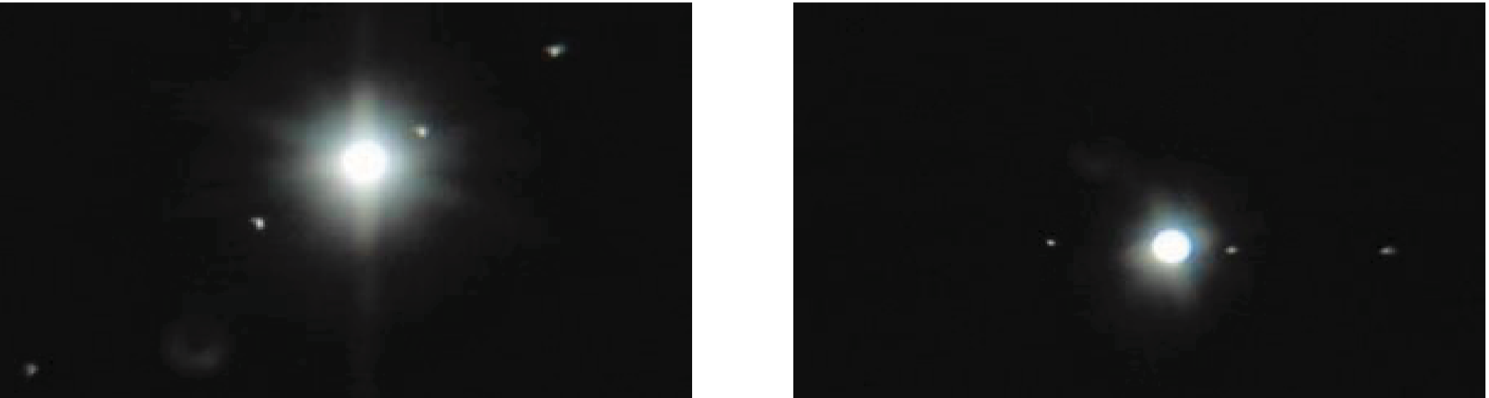 En la conformación del discurso matemático escolar y de los planes de estudio de distintos niveles se desconoce el papel que pudiera jugar el cotidiano, ese contexto extraescolar en el que los ciudadanos hacen, usan y expresan su conocimiento. Se trata de formas culturales puestas en uso en donde se hace evidente lo poco significativo que resulta la matemática escolar (Zaldívar y Cordero, 2015). Una epistemología de prácticas y usos busca permitir encuentros entre el conocimiento cotidiano del ciudadano y su conocimiento matemático en los que ambos dialogan a través de argumentos y herramientas significativos de acuerdo con las actividades que se están realizando. Como parte de ese cotidiano, estamos considerando un escenario de educación no formal o de divulgación: un museo de ciencias. En dicho escenario no tiene sentido la idea de que los ciudadanos entiendan las nociones matemáticas como en la escuela o si saben demostrarlas o aplicarlas, pues no existe sanción ni evaluación sobre la integración rigurosa de los conocimientos o sobre la construcción de los mismos (Guisasola y Morentín, 2007). Sin embargo, lo que interesa es reconocerlo como una fuente de significados al analizar el conocimiento en uso. Bajo este posicionamiento epistemológico, los aspectos analíticos dejan de ser el objetivo en la explicación de la generación de conocimiento matemático, y en cambio los argumentos, herramientas y discursos adquieren validez. Es un mecanismo de producción de conocimiento que no aísla al individuo del medio, sino que es una forma de generar lazos de interacción (Cantoral, 2013a). Consideramos pues este escenario de divulgación como un espacio de uso (Cantoral, 2013a) ya que nos provee de una gran variedad de fenómenos periódicos, como los astronómicos, que nos permitirá reconocer elementos alrededor del uso de lo periódico. Tratamos en particular con Júpiter, uno de los objetos que más seduce al público por su brillo. Cuando se observa a simple vista se ve como un gran punto brillante; con telescopio se pueden ver cuatro de sus satélites: Io, Europa, Ganímedes y Calisto (figura 9).