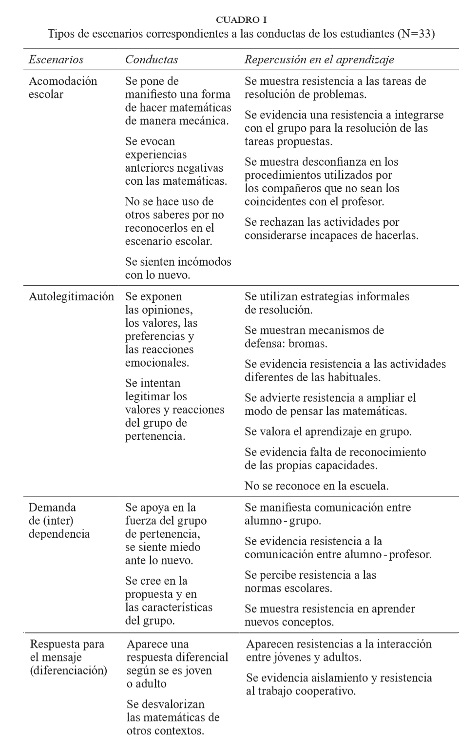 Las categorías de análisis construidas por Gómez - Chacón (2000a, 2017) posibilitan dos propuestas de análisis para el grupo y para el estudio de casos. Se estudiarán comportamientos y se establecerán perfiles en relación con las matemáticas, dispuestos en escenarios que siguen las categorías definidas por Gómez - Chacón (2000a): acomodación escolar, autolegitimación, demanda de interdependencia y demanda de respuesta para mensajes o diferenciación (resistencia). Esta clasificación nos permite comprender la relación del grupo de alumnos jóvenes y adultos con las matemáticas en el contexto escolar y cómo sus conductas repercuten en el aprendizaje de las matemáticas (véase Cuadro I en resultados).
