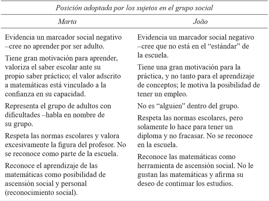 Al igual que Marta y João, otros estudiantes expresan que el espacio de las clases de matemáticas son espacios de negociación de identidades y, además, un lugar en que el fracaso está constantemente presente en la interacción. Estos jóvenes y adultos no se reconocen como constructores de saber, no se identifican con el saber matemático ni pertenecientes a una comunidad de práctica. En el contexto de adultos, al igual que lo ya diagnosticado en el aprendizaje en contexto de exclusión, el silenciamiento de los saberes prácticos cotidianos genera reacciones de mayor resistencia.