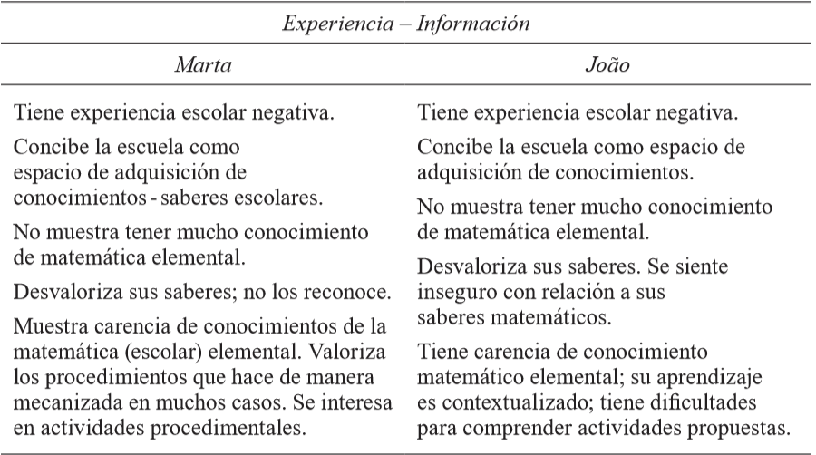 Para Marta, la información acerca de las matemáticas se reduce a los saberes transmitidos por un profesor y por los expertos en matemáticas. Por ejemplo, sus concepciones acerca de las matemáticas: “Para mí las matemáticas están en todo, pero yo las uso solo para hacer las compras en casa y ahora para ayudar a mi nieto. Yo no tengo mucha cabeza para eso” (Cuestionario A 1.4. Marta). Para João, las matemáticas se reducen a algoritmos y a las operaciones elementales, y para ser bueno en matemáticas hay que esforzarse: “Nosotros aquí en la escuela nocturna, haciendo solo una u otra cuenta no vamos a ser buenos nunca. Las matemáticas necesitan entrenamiento”. (Cuestionario A 1.2. João). Aunque estos sujetos tienen representaciones relevantes acerca de las matemáticas, las experiencias negativas, las posiciones en el grupo social y la información acerca de las matemáticas modifican su relación con el saber de forma limitada para su aprendizaje.