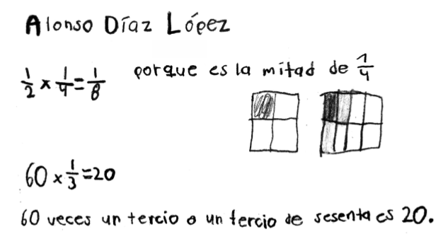multiplication of a nonunitary fraction by a whole number (how much is three fifths times twenty? ¿cuánto es tres quintas veces veinte?). In this case children can initially use the strategy of calculating first the product of a unitary fraction by the whole number (how much is one fifth times twenty? Four ¿cuánto es una quinta vez veinte? cuatro) and, finally multiplying this product by the remaining whole numerator (three times four equals twelve; tres veces cuatro es igual a doce).