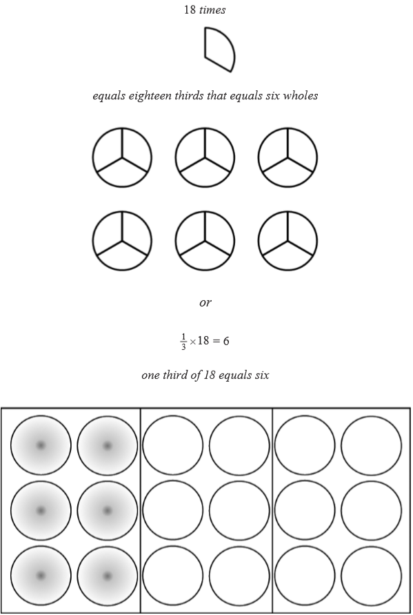 18 times one third equals eighteen thirds that equals six wholes (verbal expression) (solution drawing)