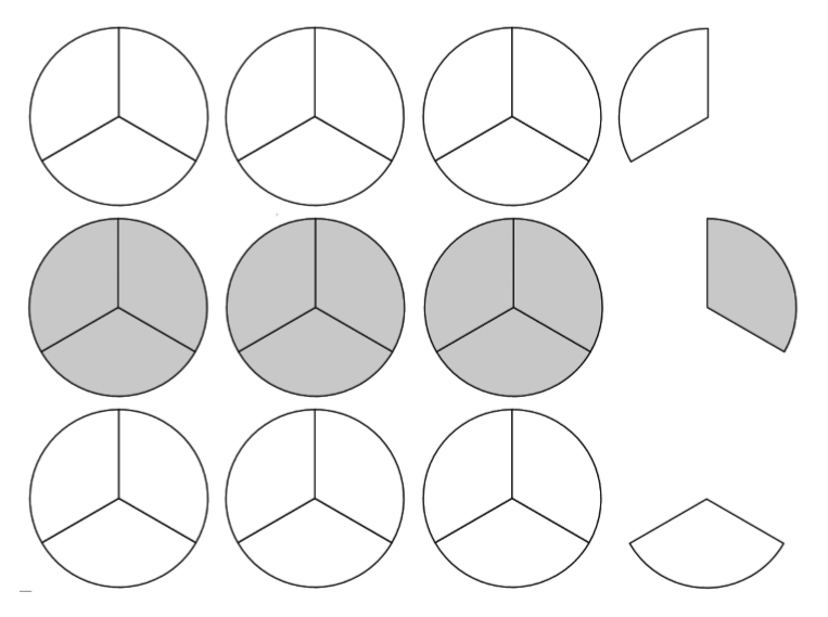 Children also can draw a picture or diagram representing every multiplication. For example, three times ten thirds equals ten can be represented as: