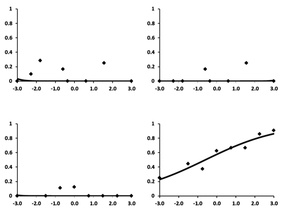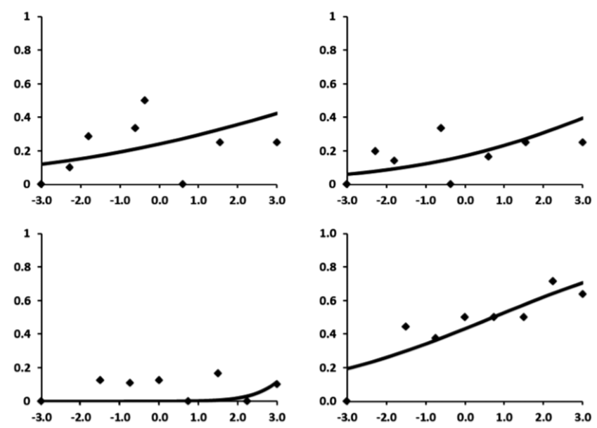Item response curves depicting the probability of success on the item how much is one-third og 18? as a function of children´s average academic mark, taken as the ability parameter. The horizontal axis is the ability level: from the left to the right, the ability level goes from lower (-3) to higher (+3) levels. The unit on this scale is known as logit (abbreviation for “log of odds unit”). Control groups graphs (above) and learning groups curves (below) show no distinctive differences between pre-test (left) to post-test (right) answers.