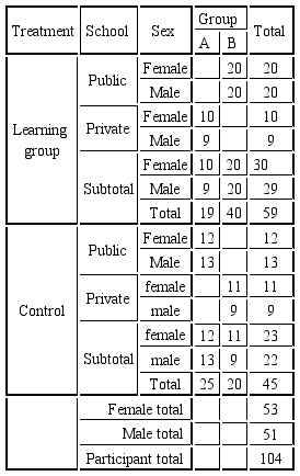 Fifth graders attending two elementary middle-income schools in Puebla city, México, participated in this study (N =104). There were two fifth-grade groups studying in each school. One school pertains to the public school system and the other one is a private school. Only students with parental consent were included in the study. According to the official requirements of the Secretaría de Educación Pública (the Secretary of Education), fifth-grade children participating in this program had their tenth birthday during the year of the study. Tests and learning sessions were developed in the children´s schools. One group played a part as a control group and the other participated as the fraction multiplication and division learning group in each school. As the group A would be the learning group in the private school we decide to take the group B as the learning group in the public school. Therefore, we have two control groups and two learning groups (see table I).