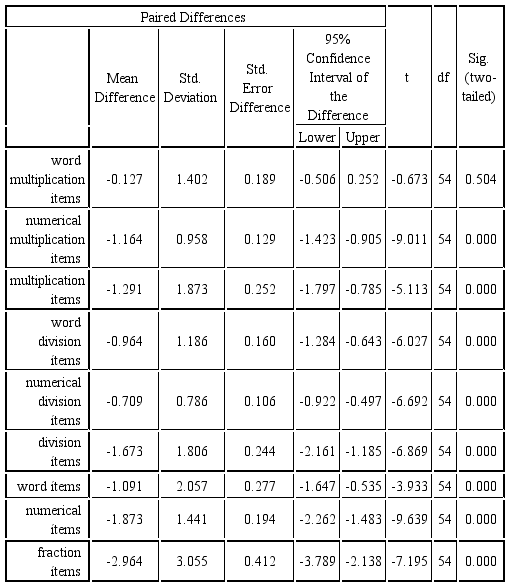 Commonly teachers use overall group test scores to analyse academic improvements. The simplest way to do this is to apply a Student’s two-tailed paired t-test (Pardo, Ruiz, & San Martín, 2009). Table IIpresents the results of a dependent samples t-test to compare general pre-test/post-test scores of learning groups (teachers do not usually compare their results with control groups) on multiplication items (word and numerical forms), division items (word and numerical forms), and total fraction items (word, numerical, and final total). There are statistically significant differences between any general scores, except for word multiplication items. Fifth-grade children can solve correctly word problems that involve fraction multiplication calculations, although they do not perform any multiplication. They calculate one-third of 18 calculating the third part of 18. On the other hand, they are not able, in general, to make any operation to calculate a quotient for a fractional division problem at the time of the pre-test.