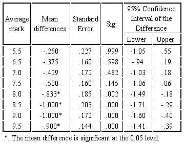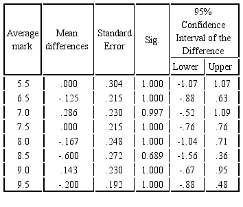 We performed a one-way repeated-measures anova on these data using Tukey’s HSD (Honestly Significant Difference) test for post hoc comparisons (Pardo & San Martín, 2010). This analysis compares the item responses by average mark with the aim of validating the item response curve result. As expected, post hoc comparisons of the item responses of the learning groups show that there is no significant difference for any average mark level (see Table III).