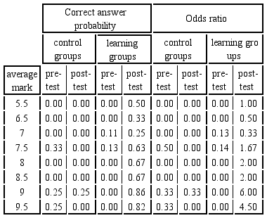 Teachers also can compare correct answer probability and odds ratio by average mark. Table V presents those data for control and learning groups.