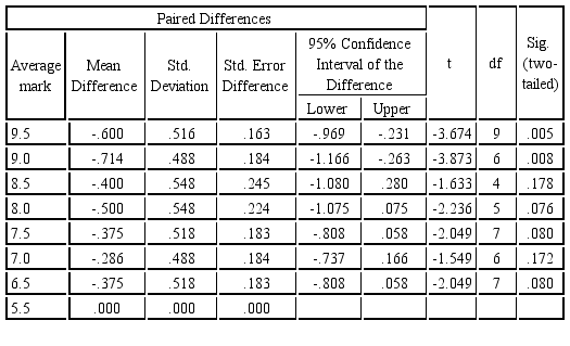 If teachers perform a Student’s two-tailed paired t-test to analyse the differences observed in this item they can observe that the learning group, in general, showed better results at post-test assessment: . But the item response curve indicates that only children with greater average marks have a better post-test performance. Teachers can corroborate it with a Student’s two-tailed paired t-test applied to each average mark. This method produces the calculations displayed in Table VI and they confirm that only children with average marks greater than or equal to 9.0 showed a significant improvement on item response (p < .01).