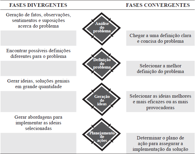Com o propósito de contribuir para resolução criativa de problemas e a tomada de decisões para a inovação, O’Dell (2001) apresenta exemplos de ferramentas e propõe que esse modelo seja utilizado em um ou por um grupo de pessoas, de modo que contribua para o entendimento da diversidade de ideias e perfis e para que incida na obtenção de um resultado em comum. No P de processo, pode ser realizada a ferramenta denominada Quatro Diamantes, que envolve: a análise do problema, a definição do problema, a geração de ideias e o planejamento de ações ou de implementação (Figura 2).