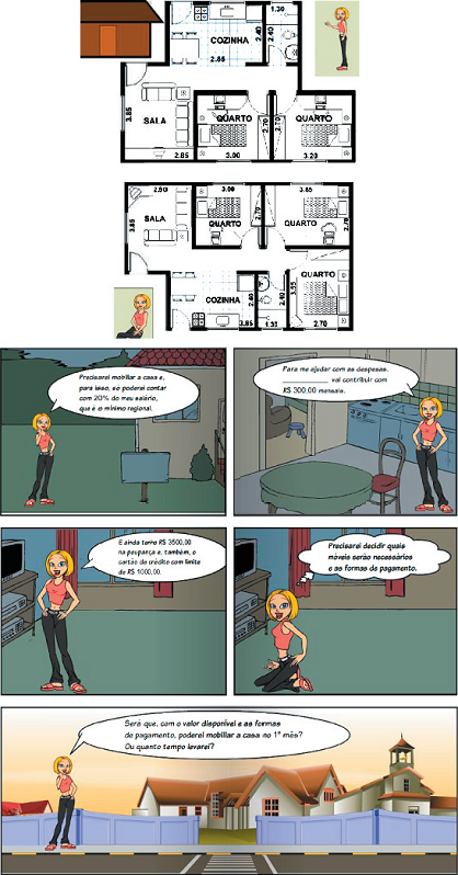 A primeira versão obtida foi analisada pelas pesquisadoras, que sugeriram o aprimoramento dos aspectos estéticos, a revisão da ortografia e a alteração das imagens das plantas baixas, para que ficassem legíveis. A seguir, pode ser observado o enunciado do problema “Mobiliando a casa - versão feminina” (<http://www.toondoo.com/ViewBook.toon?bookid=696308>), nas Figuras 3 e 4.