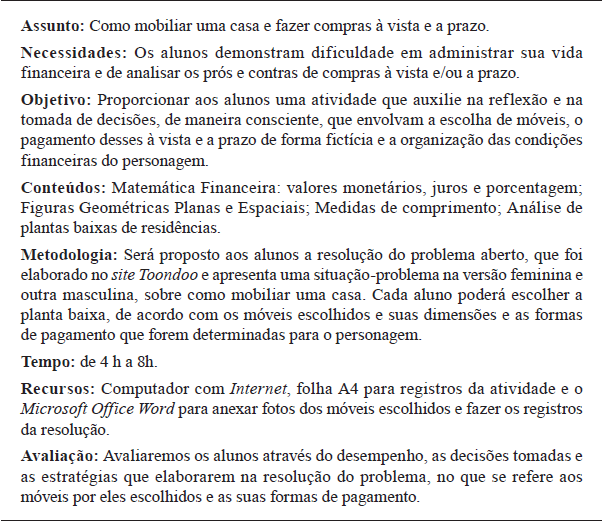 No plano de aula, verifica-se que as alunas D, E e F salientaram que o tema seria abordado para proporcionar a sua compreensão e a aprendizagem de novos conhecimentos sobre o mesmo, o que as fez determinarem o objetivo a ser atingido e os conhecimentos matemáticos que seriam trabalhados ou utilizados pelos alunos no processo de resolução. Na metodologia, constata-se que mencionaram que o problema é do tipo aberto e, por isso, os alunos poderão tomar decisões pelo personagem, escolher a planta baixa da residência que for mais adequada às necessidades e suas condições financeiras. No que se refere ao tempo previsto para a duração, recursos e avaliação, esses são condizentes aos demais elementos do plano.