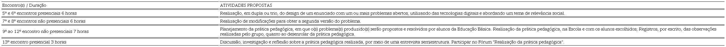 A coleta de dados, que envolve o recorte do processo formativo dos alunos, participantes do curso de extensão, ocorreu entre o 5º e 13º encontros (Quadro 1).