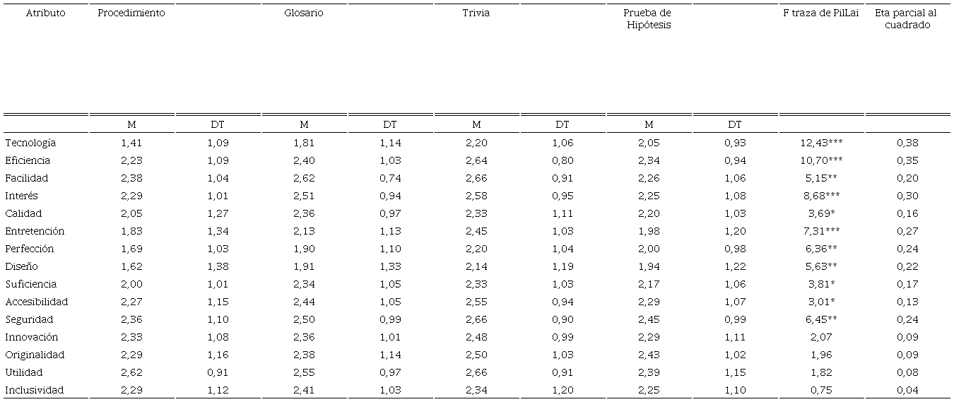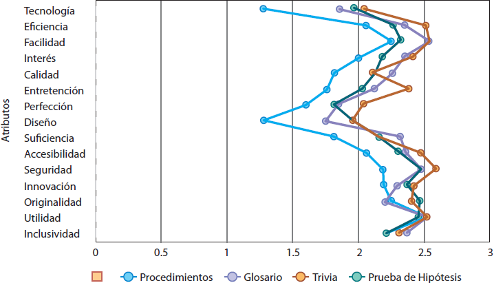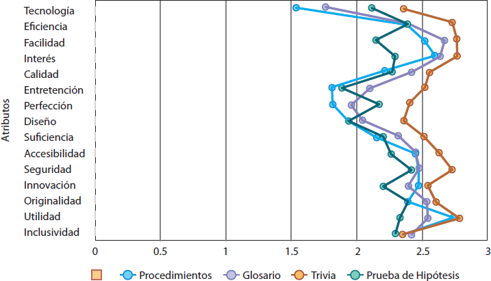 En el atributo de Tecnología se manifiestan diferencias estadísticamente significativas entre las medias de las funciones Procedimiento y Glosario (p = 0.016); Procedimiento y Trivia (p < 0.001); Procedimiento y Prueba de Hipótesis (p < 0.001) y Glosario y Trivia (p = 0.007). En el atributo de Eficiencia las diferencias se hacen notar entre las funciones Procedimiento y Trivia (p < 0.001); Glosario y Trivia (p = 0.004) y Prueba de Hipótesis y Trivia (p = 0.001). En cuanto al atributo de Facilidad las diferencias de medias se manifestaron entre las funciones Glosario y Prueba de Hipótesis (p = 0.013), así como entre Trivia y Prueba de Hipótesis (p = 0.006). En el atributo de Interés se hallaron diferencias significativas entre las funciones Procedimiento y Trivia (p = 0.009), así como también entre Prueba de Hipótesis y Trivia (p = 0.003). Solo hubo una diferencia significativa en las valoraciones promedio del atributo Calidad entre las funciones Procedimientos y Glosario (p = 0.041). Por otra parte, en el atributo Entretención se hallaron diferencias significativas entre las funciones Procedimiento y Glosario (p = 0.028); Procedimiento y Trivia (p < 0.001); Glosario y Trivia (p = 0.041) y Prueba de Hipótesis y Trivia (p = 0.003). En el atributo de Perfección solo hubo una diferencia significativa entre las funciones Procedimiento y Trivia (p < 0.001). De igual forma, en el atributo de Diseño solo hubo una diferencia significativa entre las funciones Procedimiento y Trivia (p < 0.001). En el atributo de Suficiencia también se repite que la única diferencia significativa se produce entre las funciones Procedimiento y Trivia (p = 0,037). En el atributo de Seguridad se evidenciaron diferencias significativas entre las funciones Procedimiento y Trivia (p = 0.007); Glosario y Trivia (p = 0.022) y Trivia y Prueba de Hipótesis (p = 0.007).