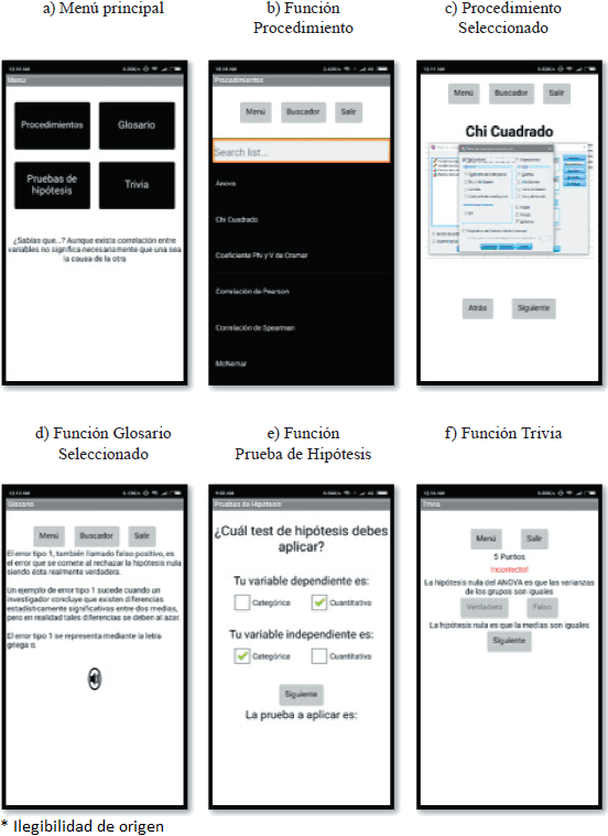 La pantalla Menú constituye la pantalla principal de la aplicación. Tal como se observa en la Figura I(a) en ella se incorporaron cuatro botones; “Glosario”, “Prueba de Hipótesis”, “Procedimientos” y “Trivia”. La programación logra que al iniciarse la pantalla Menú se muestre en la parte inferior un mensaje aleatorio de un repositorio de 36 consejos denominado “¿Sabías qué?”. Una vez que el usuario oprime alguno de los cuatro botones, la aplicación redirige hacia una nueva pantalla de acuerdo con la función seleccionada.