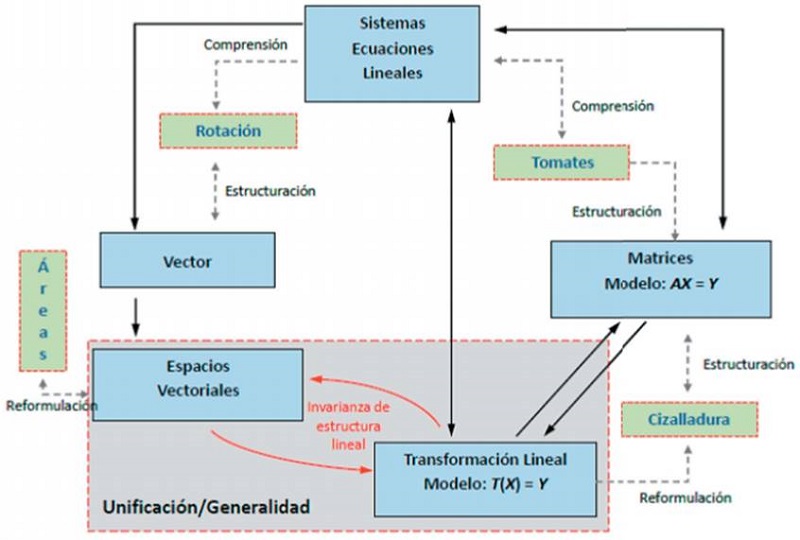 Si pensamos en la teoría del álgebra lineal, en la transformación lineal cuyo objeto de estudio es conocido sustancialmente desde el colegio, y cuyas herramientas de estudio recurren a los dominios más avanzados de la matemática, veremos, por, sobre todo, que la distinción del matematizado y de la matemática constituye de forma práctica la articulación procedural/estructural (Sfard, 1991). Debe comenzar por distinguir los métodos, herramientas y objetos que ella unificara dialécticamente. Tal sustitución, es una modelización de problemas concretos que demanda una capacidad inicial disponible: saber hacerse la pregunta del carácter lineal en relación con una variable de una función (de los términos que dependen de las operaciones lineales: valor en un punto, rotación, vectores, áreas de regiones, integrales). Como en algunos casos, la transformación lineal toma aspectos concretos, en particular, cuando matematizado y matemática pertenecen a sectores de los cuales son vistos como diferentes de la matemática, deberá entonces saber identificar la transformación, hacer corresponder las analogías, la eficacia, la economía del nuevo enfoque, lo que le conducirá a hacer elecciones para ganar en simplicidad y en fiabilidad.