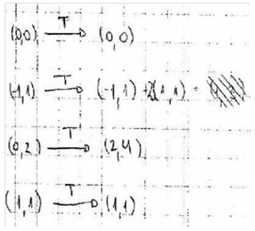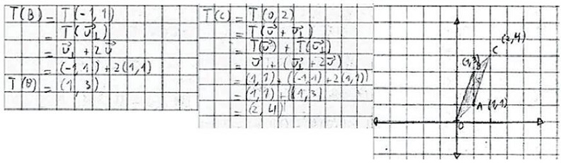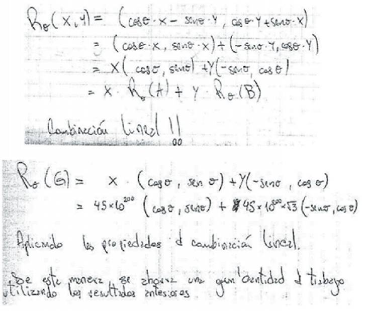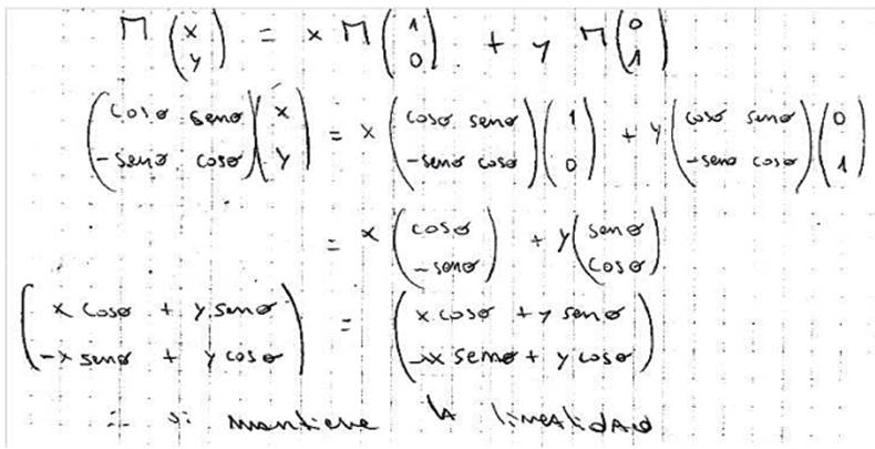 Tratan de explicitar Rθ (x,y)=xRθ (1,0)+yRθ (0,1), lo que parece intuir la propiedad lineal, pero no hay un vínculo directo con la rotación Rθ (x(1,0)+y(0,1)) para expresar la igualdad de la lineal aditiva, no se sabe realmente si utilizan la maestría de la TL en esa relación.