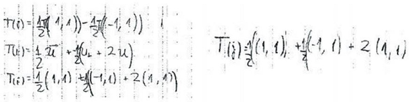 Como la escritura en combinación lineal refleja más funcionalmente el carácter lineal de la rotación el cual es invariante por un cambio de base, posiblemente, el estudiante lo asocie a un cambio de coordenadas (lineales) en el plano afín, haciendo lo que Euler, Lagrange, Gauss, entre otros, llamaban sustituciones lineales. Este método sitúa a la rotación como parte de un concepto más general y abstracto.