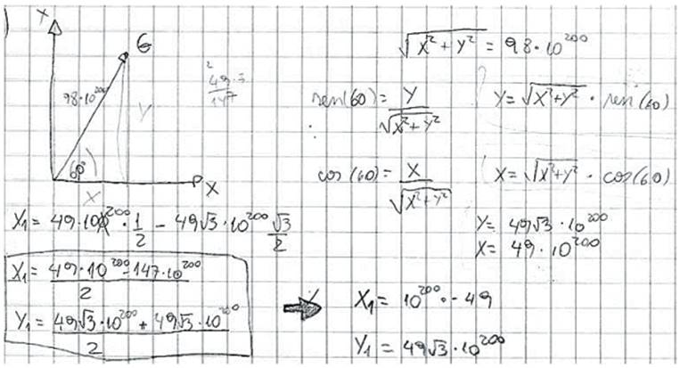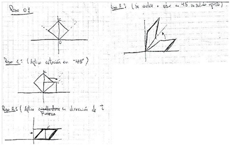 “Por ejemplo en Física, cuando trabajamos con poleas móviles, había que cambiar el ángulo en que ejercía la fuerza de la tensión, entonces ese cambio de ángulo era una rotación, lo que nos explicaba la profesora, pero no nos explicó, no entró a detallar, cómo se calculaba, porque era mucho más fácil trabajar las componentes separadas. Hacía esos cambios y luego al final las juntaba, porque eran varias operaciones, a una sola. Entonces, si lo separaba eran operaciones por coordenadas que era mucho más fácil, tal vez era mucho más largo, pero más fácil que calcularlas así … como un todo”