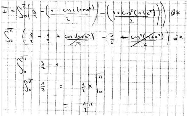 En el problema 1c), se solicita interpretar la expresión I de integrales en base a la figura, pero no se precisa las relaciones, luego el rescurso a la figura será solo para estimar el cáculo del área, pero sin precisión numérica. Se puede prever que mayoritariamente el comportamiento de los estudiantes será la utilización de la integral en el sentido de Riemann-Darboux, y es posible que asuman que “la integral es un área…”. Para responder a la pregunta de asociar el área por una figura geométrica sencilla es posible que los estudiantes se den la tarea de calcular el valor numérico del área mediante el cálculo de las primitivas. Pero, de las expresiones de las funciones es posible que renuncien a ese cálculo. Por la propiedad de simetría de la integral y linealidad, el estudiante debería reunir la expresión de I en una sola integral y constatar que, en esta nueva presentación de I el cálculo se simplifica. Visualizar estas propiedades lineales en el contexto geométrico, es posible que tenga dificultades.