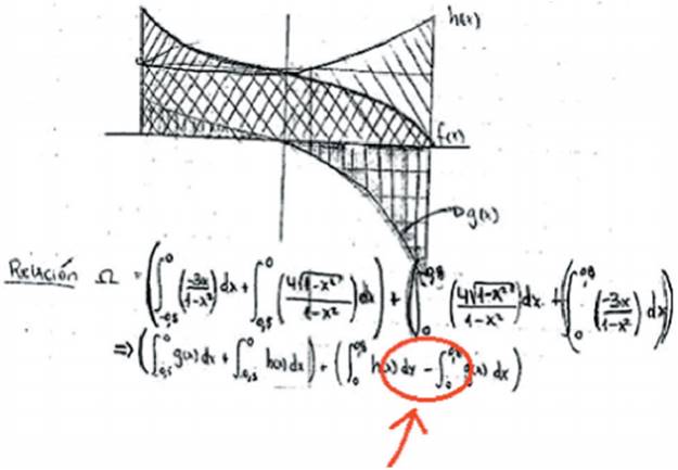 Los conocimientos previos se revelan necesarios, pero no suficientes para estimar el área de Ω. Se percibe incoherencia lineal para resolver geométricamente el cálculo del área por el método analítico que disponen. De las gráficas de la figura aparecen resultados numéricos negativos derivados del cálculo integral que más bien responde al siguiente teorema en acto: “como es área, no puede ser negativa, entonces se cambia el signo”