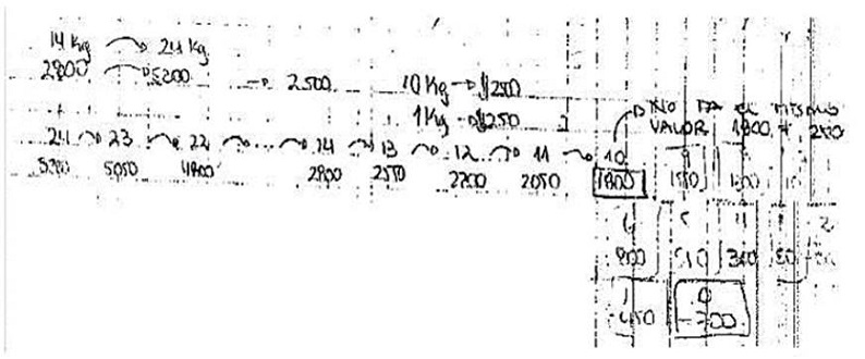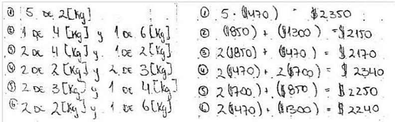 Los equipos ensayan formas de combinaciones apoyados en un modelo de tipo proporcional y dejan entrever implícitamente un sentido lineal de la correspondencia “peso-precio”. Podemos observar que hacen formas de “combinar los paquetes” y no de combinar el “peso de los paquetes.