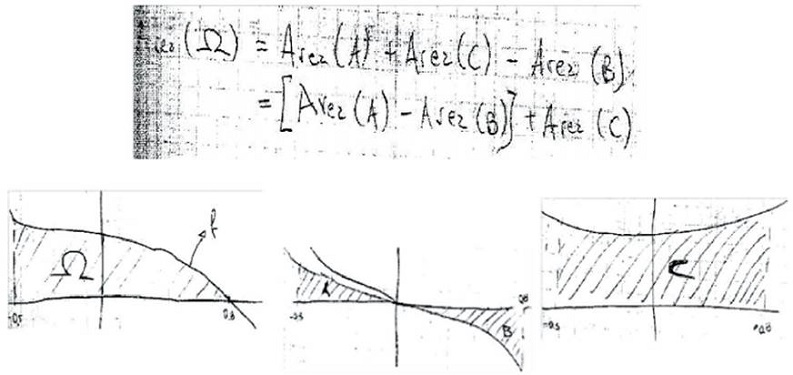 b) De las gráficas de la figura identificar cada función y establecer una relación entre las regiones para medir el área de Ω como el área de la región acotada por el gráfico de estas funciones.