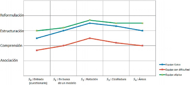 En el nivel de asociación instruido por la comprensión, está el equipo con dificultad que se dejan llevar por el contrato didáctico habitual. Se inclinan por un enfoque procedural con la voluntad de vincular las propiedades lineales. Muestran un pensamiento pragmático y no entran en consideraciones estructurales sobre las propiedades del modelo, suponen un modelo proporcional sin establecer las condiciones de aplicación en el contexto del real. En la rotación hacen funcionar el concepto a nivel de coordenadas cartesianas y se apoyan en la herramienta de sistemas de ecuaciones lineales. Perciben una idea de la acción geométrica de la cizalladura que no es coherente con su definición, ya que, el sentido lineal de la definición les resulta complicado al no reconocer el tipo de enunciado del problema. Aunque reconocen las propiedades lineales para la reformulación del área, y establecen las relaciones en el marco geométrico en coherencia, no utilizan el área de polígonos simples para aproximar el área de la región como una forma de validar el valor total del área. Se quedan en un nivel de comprensión de muy poca estructuración.