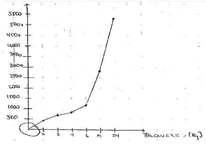 Está entonces la tendencia de colocar los valores en relación proporcional utilizando combinaciones lineales. Luego, en consideración de los diferentes valores, para el precio de 10 kg, los estudiantes están obligados a establecer un valor promedio como una manera coherente y eficaz de un precio único. Es posible que realicen una representación gráfica de los valores para pronunciarse respecto de la colinealidad con el origen (0,0) y para justificar el resultado “por no llevar tomates, no se debe pagar”. Este resultado, “dejar fijo al vector cero” es una consecuencia de estructura lineal de una TL. Un modelo por tramos poligonales puede responder a este resultado simplemente por imposición.