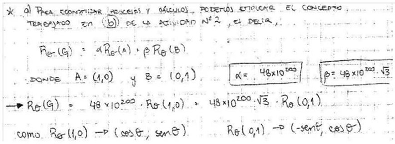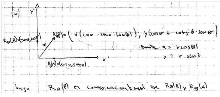 Pero también, por las identidades trigonométricas se podría esperar que los estudiantes calculen Rθ (xA+yB) sin la estructura vectorial de R2, por ejemplo, con el método geométrico-trigonométrico pueden muy bien evitar las expresiones de combinación lineal para determinar la posición de Rθ (G) en términos de coordenadas.