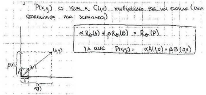 “…pensé que la rotación de P era lo mismo que rotar solo las componentes de P, o sea, la rotación de A y la rotación de B estaban multiplicadas por un escalar que hacían como un caso general de la rotación de las componentes canónicas. Entonces alfa veces la rotación de A más beta veces la rotación de B iba a ser la rotación del punto P, porque P era combinación lineal de alfa veces A y beta veces B.”