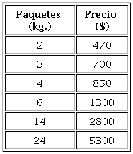 Un comerciante dispone para la venta una oferta de tomates envasados en paquetes de 2, 3, 4, 6, 14 y 24 kilogramos. Los precios de estos paquetes son los siguientes: