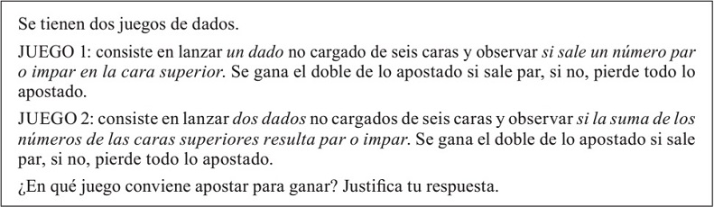 Se seleccionó la situación de la segunda clase, la cual se basa en dos experimentos aleatorios con dados equilibrados reales de 6 caras. La comprensión de los experimentos está facilitada por las experiencias lúdicas previas de los sujetos, debido a que el uso de experimentos aleatorios con artefactos, tales como dados, monedas y cartas, son comunes en el currículo chileno. A partir de la presentación de estos experimentos aleatorios como juegos (ver figura 1), los sujetos debían justificar de forma escrita su decisión respecto a la conveniencia de uno de los juegos para ganar. La implementación de la situación consideró 45 minutos, que contempló un primer momento para que los estudiantes efectivamente experimentaran ambos juegos con dados, y un segundo momento, para llegar a consenso, argumentar la decisión y registrarla en forma escrita.