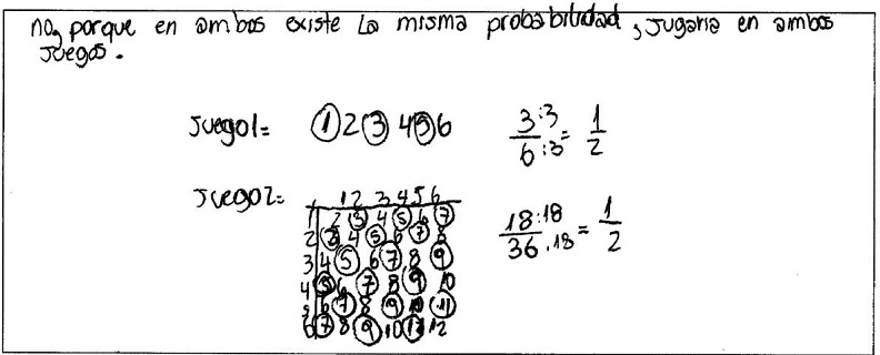 En este caso, tanto el pensamiento probabilístico como el pensamiento proporcional se muestran sostenidos por elementos cuantitativos, logrando concordancia. Sin embargo, el cálculo de la probabilidad resulta incorrecto. Las causas de este error no obedecen a las dificultades en elaborar un pensamiento basado en proporciones, sino en asumir erróneamente la equiprobabilidad de los eventos que constituyen el espacio muestral establecido para el juego 2.
