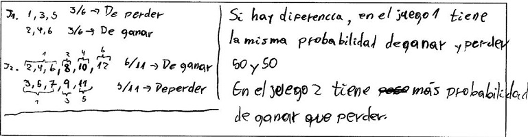La pareja P26 determina los espacios muestrales del juego 1 y 2, rotulándolos como J1 y J2 (ver figura 3). Para J1 describe eventos elementales separados en dos casos, el caso en que se pierde, {1,3,5} y el caso en que se gana, {2,4,6}, y en ambos calcula la probabilidad mediante la regla de Laplace como . Para J2 determina el conjunto correspondiente al recorrido de la variable aleatoria suma de dos números del 1 al 6 y también lo separa según el criterio de ganar y perder, esto es, {2,4,6,8,10,12} y {3,5,7,9,11} respectivamente, lo cual hace que calcule una probabilidad de para el primero y para el segundo. En consecuencia, P26 responde que el juego 1 tiene “la misma probabilidad de ganar y perder...”, mientras que para el juego 2 indica que “tiene más probabilidad de ganar que perder.”
