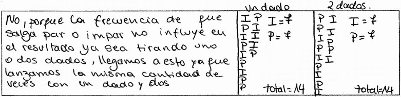 La pareja P16 realizó 14 veces ambos experimentos aleatorios (ver figura 4). Para el juego 1 obtuvieron siete resultados en que el número observado en la cara superior del dado era impar y siete en que era par, rotulando como I = 7 y P = 7, respectivamente. De igual forma procedieron para el juego 2. Para cada juego, registran los resultados en una lista vertical, cuyas secuencias son distintas, pero las cantidades resultantes para los resultados par e impar son las mismas. En base a dicha experiencia, P16 concluye que ambos juegos tienen la misma probabilidad de ganar “... la frecuencia de que salga par o impar no influye en el resultado ya sea tirando uno o dos dados...”.