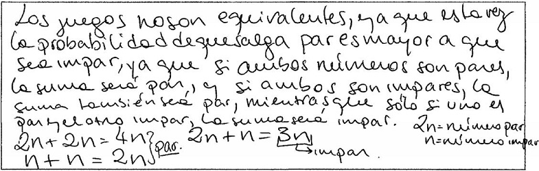 Este caso evidencia dos dificultades, por una parte, se cambia el tipo de espacio muestral de referencia, de uno de eventos elementales a otro de eventos descritos según paridad del resultado de cada dado y, por otra, el análisis de los resultados posibles para el juego 2 no distingue el evento par - impar del evento impar - par. Junto con lo anterior, el recuento de los resultados posibles realizado para el juego 2 manifiesta un sesgo de equiprobabilidad.