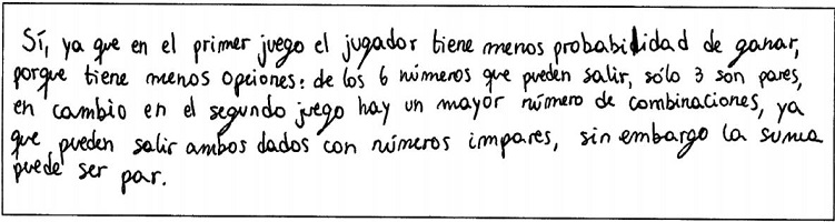 La pareja P24 argumentó que el primer juego “tiene menos probabilidad porque tiene menos opciones”, [esto es, {1,2,3,4,5,6}] tiene cardinalidad 6 y “solo 3 son pares”, mientras, para el segundo juego, “hay un mayor número de combinaciones [entonces hay mayor probabilidad de ganar]”, pues si se tienen “ambos dados con números impares..., la suma puede ser par” (ver figura 6).