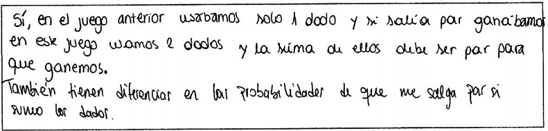La pareja P19 reconoce la existencia de diferencias entre ambos juegos, pero la argumentación se reduce a repetir las características de cada uno, como el número de dados que se usa en cada caso y las condiciones que permiten ganar (ver figura 7). El argumento expresa que la diferencia está en las probabilidades de obtener par en cada juego, que es finalmente lo que permite ganar.