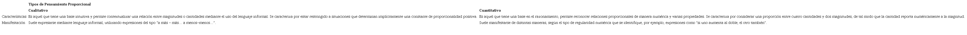 Para efectos de este estudio, se entiende pensamiento proporcional como las intuiciones y los razonamientos que guían las acciones de relacionar o comparar razones mediante una proporción, implícita o explícitamente, pudiendo ser este cualitativo o bien cuantitativo, según se caracteriza en la Tabla I.