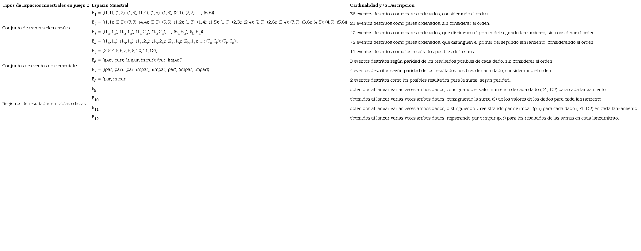 Para tomar una decisión sobre la conveniencia de elegir un juego u otro, los estudiantes debían comparar las probabilidades de ganar en ambos juegos, esto es, que salga par o la suma sea par. Varios son los estudios que señalan que el espacio muestral es una construcción clave en el desarrollo del pensamiento probabilístico (e.g., Chernoff y Zazkis, 2011; Jones, Langrall, Thornton y Mogill, 1999; Nikiforidou, 2019). Dado que la definición escolar de espacio muestral hace alusión al conjunto de todos los resultados posibles de un experimento aleatorio, es común que surjan distintos tipos de conjuntos, no necesariamente equiprobables, según qué elementos se consideren de interés (Chernoff y Zazkis, 2011). Así, los estudiantes suelen describir espacios muestrales no convencionales, es decir, listas o conjuntos de muestras que se componen de eventos no elementales. Previniendo lo anterior, se realizó un análisis a priori de la situación, estableciendo algunos posibles conjuntos que podrían ser referidos por los estudiantes como espacios muestrales.