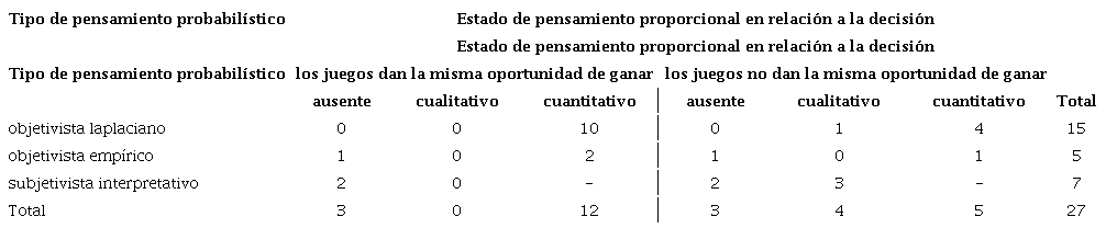 De todos los casos clasificados en la Tabla IV (véase página siguiente), el 56% de estos (15) argumentan que ambos juegos dan la misma oportunidad de ganar, presentando mayormente un pensamiento proporcional cuantitativo y un tipo de pensamiento probabilístico objetivista laplaciano. Los que tomaron la decisión contraria, esto es, que los juegos no dan la misma oportunidad de ganar, presentan una mayor variabilidad en los argumentos, respecto al estado del pensamiento proporcional y al tipo de pensamiento probabilístico.