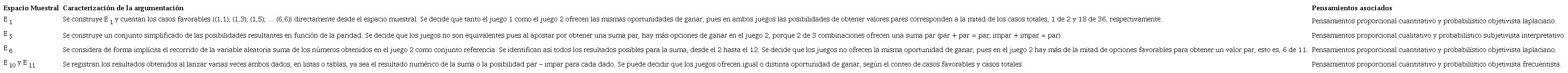 Finalmente, y de acuerdo a lo previsto en la sección 4.3.1., fue posible identificar distintos espacios muestrales referidos al juego 2. La siguiente sección presenta el análisis de los tipos de espacios muestrales referenciados por los estudiantes y cómo se vinculan con los tipos de pensamiento probabilístico y los estados de pensamiento proporcional.