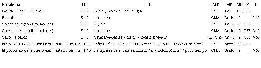 En la tabla siguiente (Tabla I) se describen características de problemas que pueden formar parte de una propuesta como la nuestra. Obviamente, el número de problemas no es lo que la caracteriza, pues este puede variar en función de los objetivos que se persigan, la disponibilidad, etc. sino el método usado para su resolución.