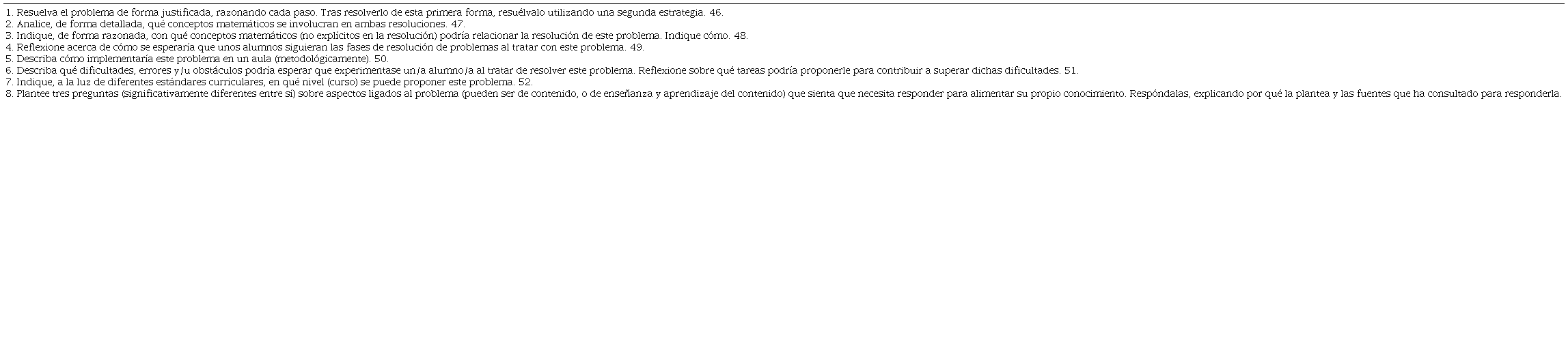 El experimento de enseñanza consistió en una serie de 8 tareas, de las cuales una se basaba en la familiarización con elementos curriculares y otra en la explicitación de creencias sobre la matemática y su enseñanza y aprendizaje, y no serán objeto de análisis en este estudio. Las seis tareas restantes, presentaban un problema matemático que permitiera diversas estrategias de resolución, y un guion de reflexión (Cuadro 1) cuya estructura general estaba orientada por los subdominios del modelo MTSK, pretendiéndose que el guion invitara a movilizar todos los subdominios. Así, las dos primeras preguntas incidían de forma especial en el Conocimiento de los Temas, llevando a los profesores al análisis de la situación en detalle, y fomentando la consideración de cierto grado de flexibilidad matemática (Star y Rittle-Johnson, 2008), al considerar dos posibles resoluciones. La segunda y especialmente la tercera pregunta pretendían que el maestro profundizase en el contenido matemático que aparecía en el problema, buscando relaciones tanto entre las resoluciones que construyese, como con otros contenidos matemáticos, invitando a movilizar Conocimiento de la Estructura Matemática. La cuarta pregunta profundizaba en el Conocimiento de la Práctica Matemática, a la vez que en el de las Características del Aprendizaje de las Matemáticas, y en particular en la interacción de los alumnos en las fases de la resolución de problemas (Polya, 1965). La sexta incidía en este último subdominio, así como en Conocimiento de la Enseñanza de las Matemáticas, al igual que la quinta pregunta al conducir a la reflexión sobre de qué forma organizar una sesión alrededor del problema dado. La séptima pregunta centraba la reflexión en el Conocimiento de los Estándares de Aprendizaje de las Matemáticas que pudieran relacionarse con el problema a discutir y la octava se añadió como instrumento de detección de las necesidades formativas declaradas por los maestros, de manera que en cada ciclo se obtuviera información de cara a completar el contenido para siguientes ciclos. Este guion de preguntas fue validado por profesores con amplia experiencia en formación continua de profesores de matemáticas.