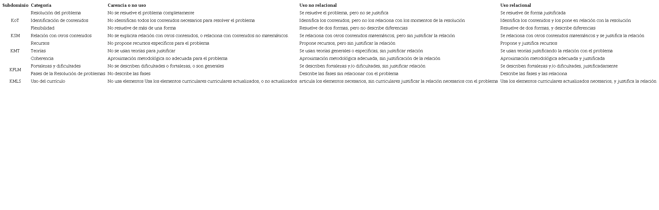 En cuanto al conocimiento a evaluar, sel estudio e centró en cinco de los seis subdominios de MTSK, obviando el Conocimiento de la Práctica Matemática, dados los obstáculos que suele generar la obtención de datos de dicho subdominio cuando no se tiene posibilidad de obtener información complementaria, en forma, por ejemplo, de entrevistas (Delgado-Rebolledo y Zakaryan, 2019), que no eran posibles en este contexto. Así, en lo relativo al Conocimiento de los Temas (KoT), se evaluó la resolución de la tarea, la identificación de contenidos, y la flexibilidad matemática. En el Conocimiento de la Estructura Matemática (KSM), se evaluó la relación con contenidos matemáticos ajenos a la tarea. Centrándonos ahora en los subdominios ligados al Conocimiento Didáctico del Contenido, y en particular al Conocimiento de la Enseñanza de las Matemáticas, se evaluó el uso de recursos, de teorías, y la coherencia entre las tareas propuestas. En cuanto al Conocimiento de las Características del Aprendizaje de las Matemáticas (KFLM), se abordaron dos aspectos: el conocimiento de fortalezas y dificultades, y la descripción de formas de interacción de posibles alumnos con la tarea, en particular respecto de las fases de resolución de problemas. Finalmente, en lo relativo al Conocimiento de los Estándares de Aprendizaje de las Matemáticas (KMLS), nos centramos en el uso del currículo, y en particular en el grado de justificación de la articulación entre los distintos bloques curriculares.