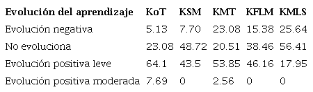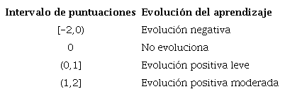 Para evaluar el aprendizaje, se calculó la diferencia entre los valores del segundo punto de control y el primero, respecto de cada una de las categorías reflejadas en la hipótesis de aprendizaje, dando un valor que reflejaba la evolución del aprendizaje. Una vez obtenidas las puntuaciones para cada categoría, se agruparon por subdominios a través de una media aritmética. Así, las puntuaciones relativas a la evolución del conocimiento en cada subdominio oscilaron entre -2 y 2 puntos. Estos valores se organizaron según se indica en la Tabla I, para tener una clasificación operativa:
