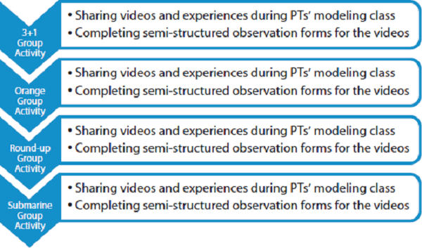 PTs showed the video recordings of the activities they had performed with their peers in their MM class. The students were asked to watch the videos and listen to their fellow classmates describe their experiences while conducting these activities. After sharing videos and experiences, students participated in class-wide discussions in which the activities performed, the PTs conducting them, the students involved, the classroom environment, and the classroom teacher’s attitude were all addressed from various angles. PTs listened to each other as they shared their experiences and even offered each other feedback based on the MM training they had received. Immediately following this, the researchers then used a semi-structured observation form to record what each PT thought about the video they had watched one day earlier, which was then uploaded to EDMODO. This was repeated for four weeks. Figure 1 gives a general overview of the research process.