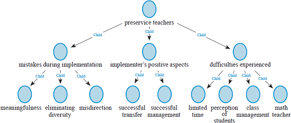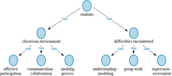 Figure 10 reveals that participants’ opinions regarding students are divided into two separate categories, namely Classroom Environment and Difficulties Encountered. Under the former category are the subcategories effective participation, communication-collaboration, and modeling process whereas under the latter category are the subcategories understanding-modeling, group work, and expression-assessment.